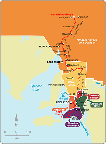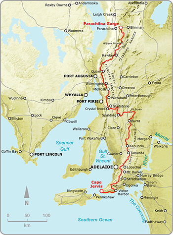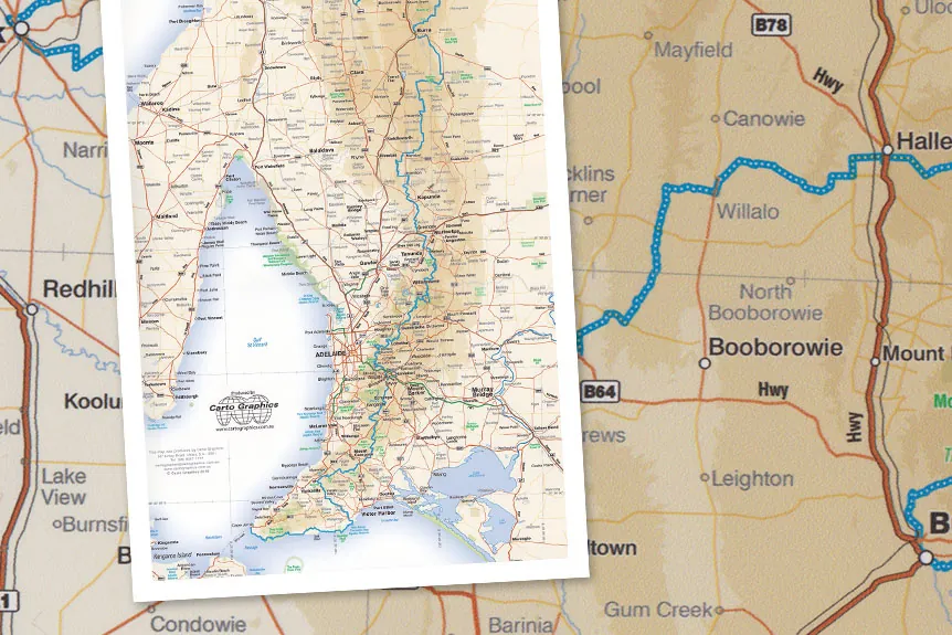 In addition to the DEW maps of the Heysen Trail, Carto Graphics has produced a series of four printed regional maps showing the location of the Trail in relation to nearby towns and roads. As much of the Trail is on private property, these maps can help you find the best public access if you’re driving to your start and end points on the Trail. Although the Trail is marked, they don’t include enough detail to be used for navigating as you walk along the Trail.