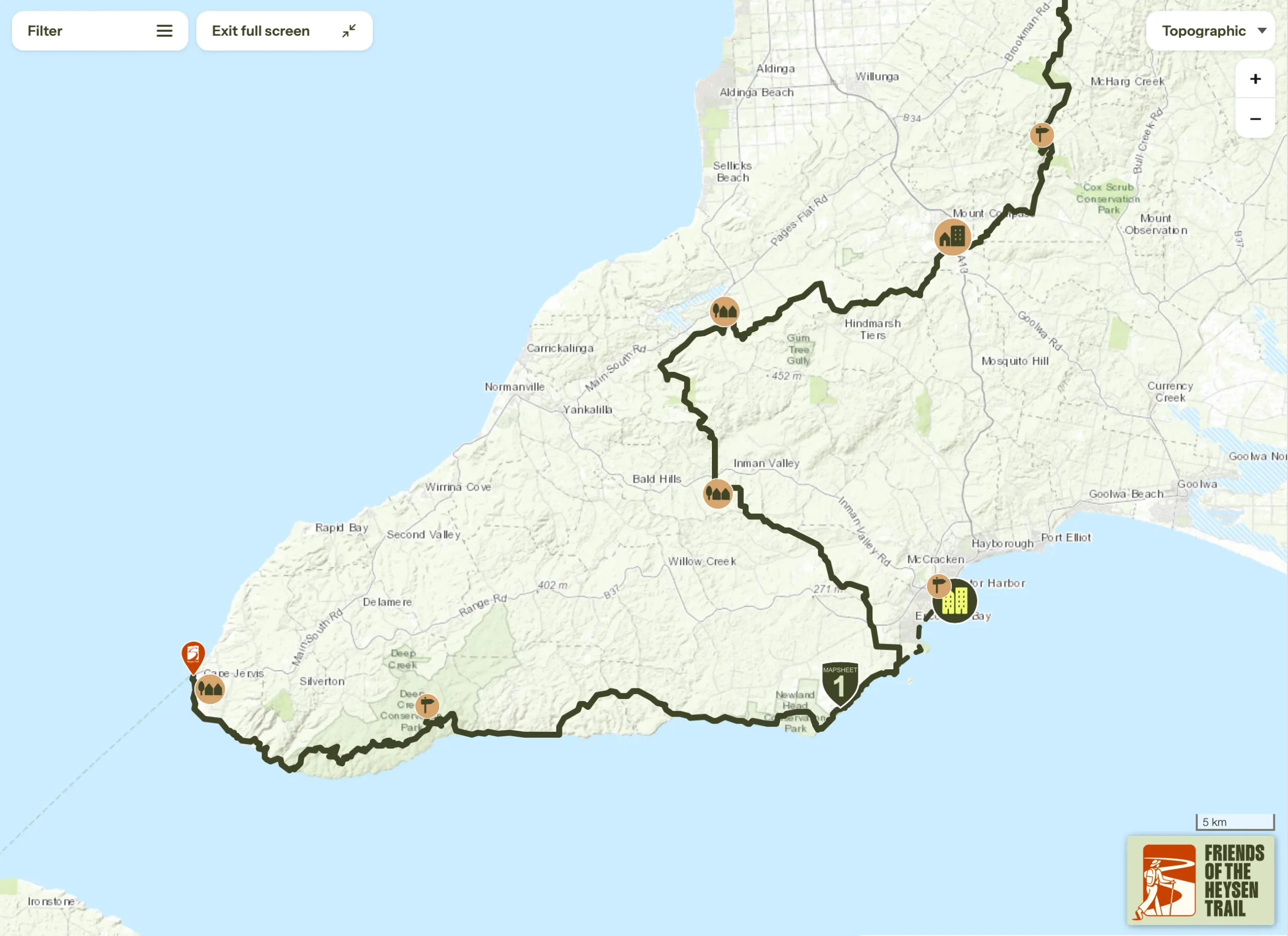 Our interactive Heysen Trail map has layers showing the route covered by each of the eight official map sheets. You can also add layers for: