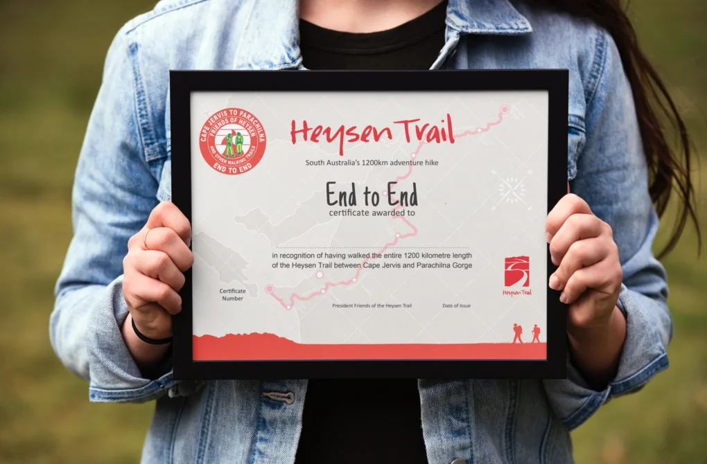 The Friends of the Heysen Trail issue certificates to people who have hiked the entire Heysen Trail from Cape Jervis to Parachilna Gorge. There are also cloth badges, which can be sewn onto your backpack or hat.